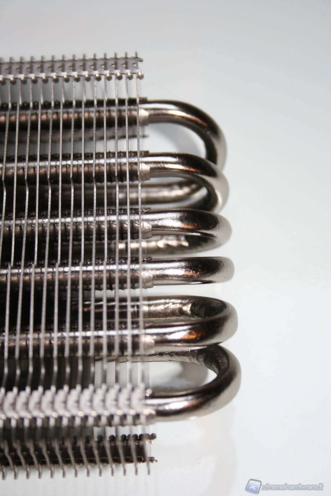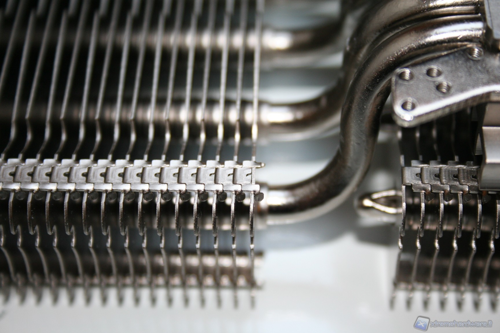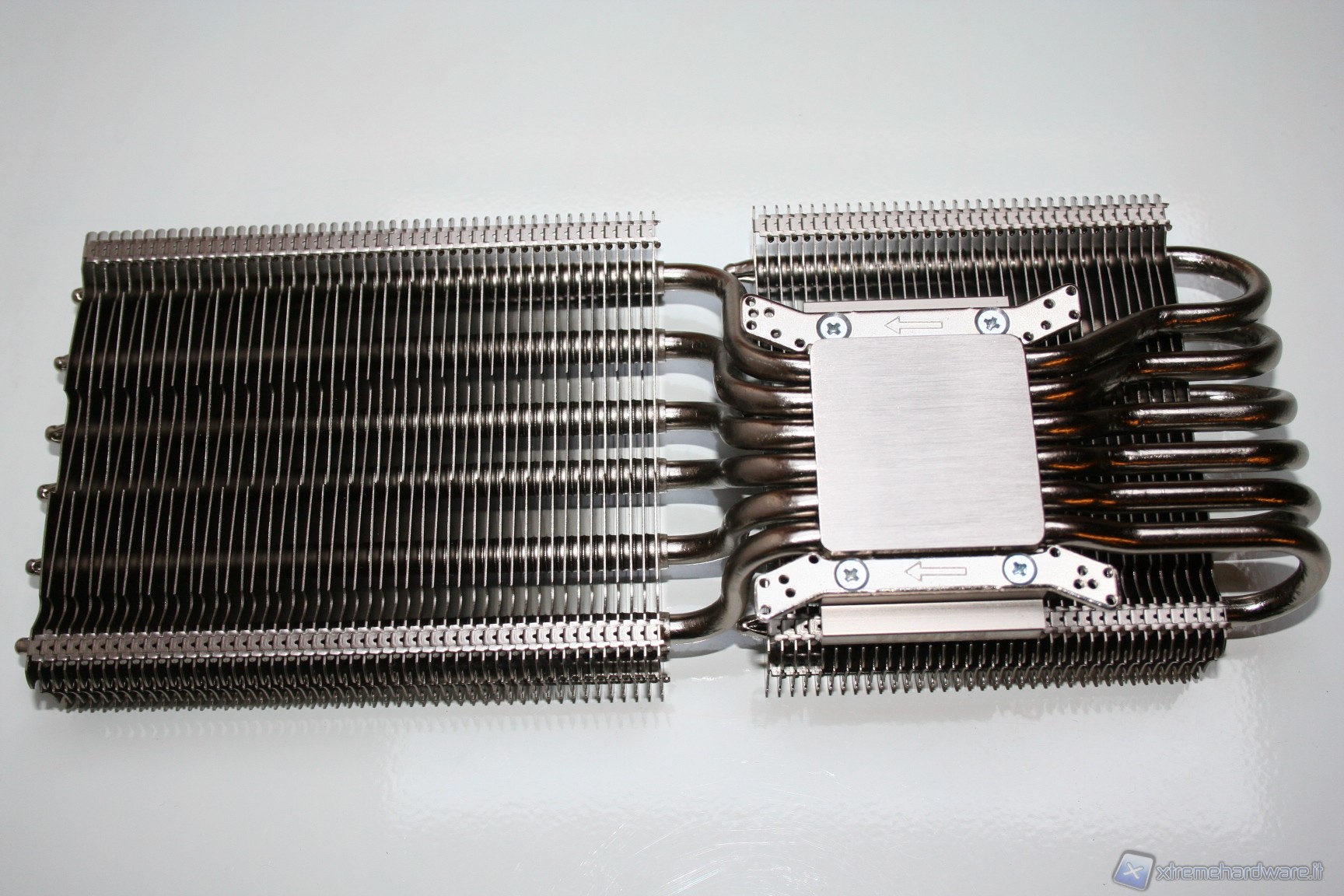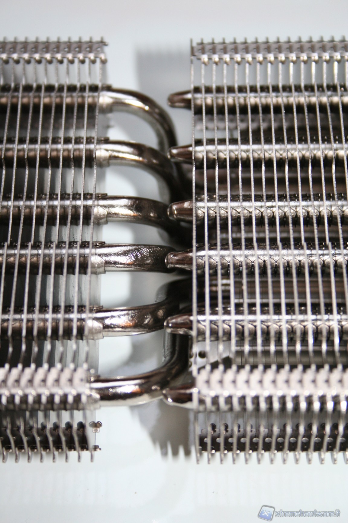 L’ottima nichelatura del rame, sia delle heatpipe, sia della base, oltre ad essere molto piacevole allo sguardo è sinonimo dell’elevatissima qualità costruttiva di quest’unità. Le 12 heatpipe partono dalla base e suddividono il dissipatore in due blocchi principali. Inoltre le alette interne hanno una particolare struttura che sebbene non aumenti di molto la superficie dissipante, permette di ottenere risultati migliori con ventole aventi una minore pressione statica, quindi nel complesso temperature migliori con ventole più silenziose; ovviamente però maggiore è la velocità di rotazione e migliori saranno i risultati complessivi. Se riuscirà a tenere a bada una GTX 480 con solo due ventole da 1100 RPM e 61 CFM saremo dinanzi ad un prodotto molto interessante. La distanza tra le alette è 1.8 mm, che comparata ad altri dissipatori in commercio è elevata. I due blocchi sono ripartiti in 49 e 35 alette, aventi 6 heatpipe ciascuno. Buona la finitura della base, anche se non è lucidata a specchio.