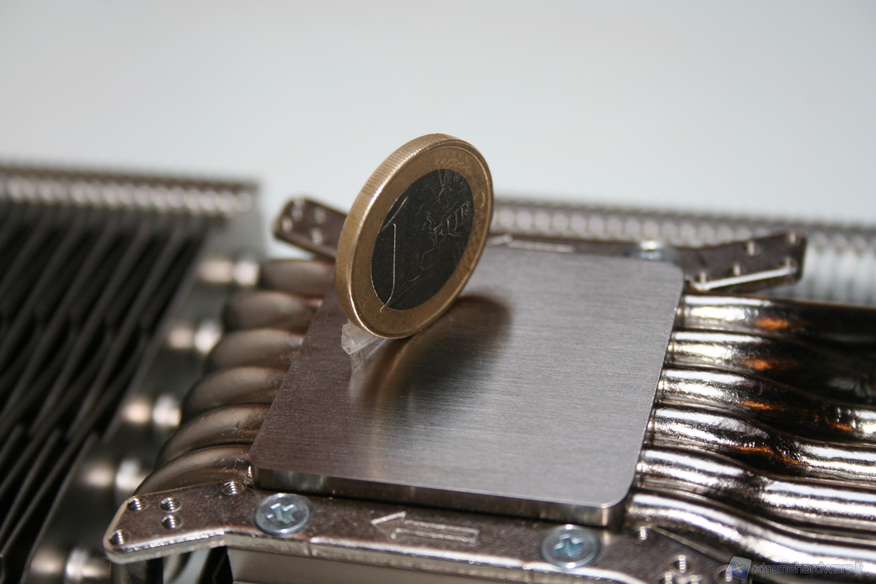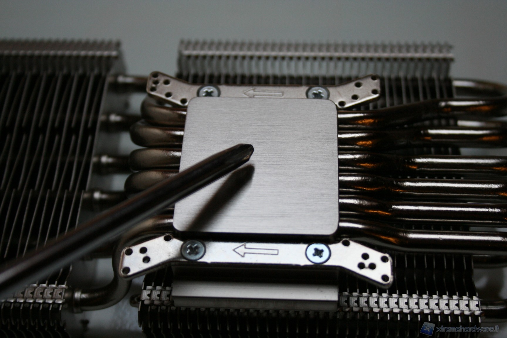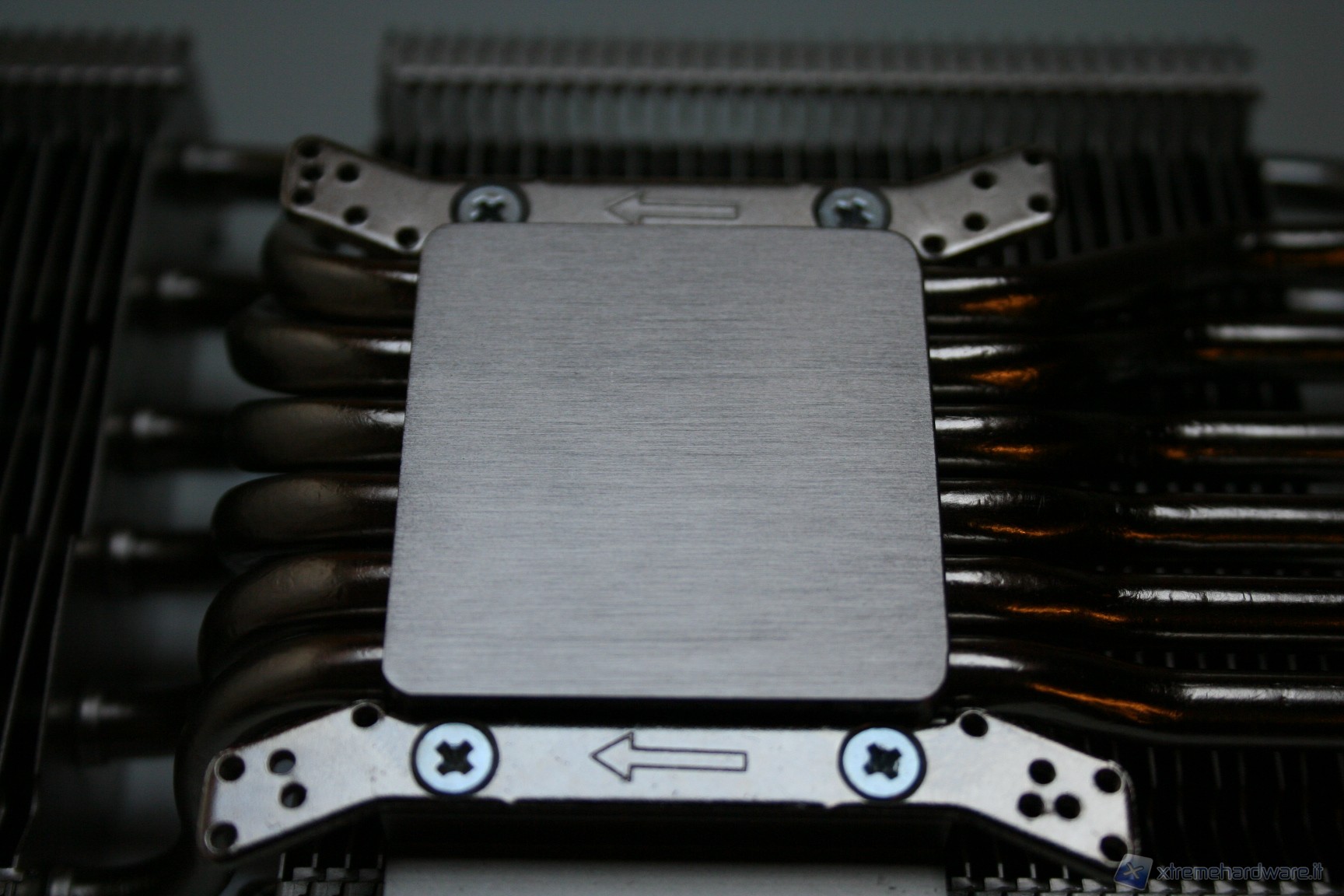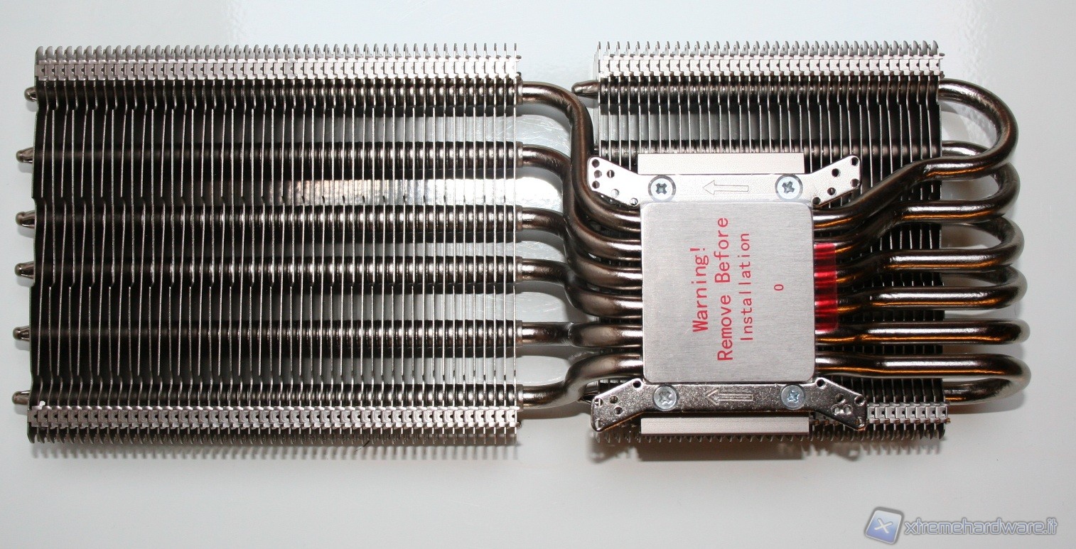 L’ottima nichelatura del rame, sia delle heatpipe, sia della base, oltre ad essere molto piacevole allo sguardo è sinonimo dell’elevatissima qualità costruttiva di quest’unità. Le 12 heatpipe partono dalla base e suddividono il dissipatore in due blocchi principali. Inoltre le alette interne hanno una particolare struttura che sebbene non aumenti di molto la superficie dissipante, permette di ottenere risultati migliori con ventole aventi una minore pressione statica, quindi nel complesso temperature migliori con ventole più silenziose; ovviamente però maggiore è la velocità di rotazione e migliori saranno i risultati complessivi. Se riuscirà a tenere a bada una GTX 480 con solo due ventole da 1100 RPM e 61 CFM saremo dinanzi ad un prodotto molto interessante. La distanza tra le alette è 1.8 mm, che comparata ad altri dissipatori in commercio è elevata. I due blocchi sono ripartiti in 49 e 35 alette, aventi 6 heatpipe ciascuno. Buona la finitura della base, anche se non è lucidata a specchio.