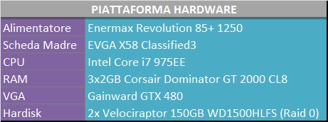 Al fine di uniformare e rendere quanto più attendibili i risultati, i test sono stati condotti con una temperatura ambiente controllata di 21° C. La CPU, un i7 975EE, è stata portata ad una frequenza di overclock di 4205 MHz per un consumo lineare sotto carico di circa 250 Watt. Per raggiungere questo carico è stato sollecitato anche il controller della memoria integrato nel processore. Le RAM usate per il test, delle Corsair Dominator GT 2000, sono state portate in overclock del sistema ad una frequenza di 1740 con timing CL7-8-7-22 1T.