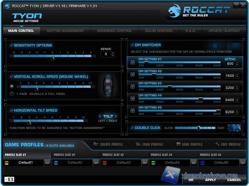 Avviato il software di gestione, avremo come sempre una grafica scarna di immagini ma ricca di impostazioni da regolare ed impostare a nostro piacimento, secondo gli utilizzi che faremo del mouse. La schermata principale, chiamata ‘’Main Control’’, è caratterizzata dalla presenza di diverse barre con slides che ci permetteranno di regolare la sensitività del mouse, la velocità di Scroll, i DPI ed i vari step e di creare ed editare i 5 profili disponibili. Non manca anche la regolazione della velocità della pinna/tasto presente sul dorso del mouse. I DPI potranno essere regolati solo a step di 200 e non di 50 o 100. Non crediamo sia un grave difetto per i classici videogiocatori. Non manca la possibilità di disabilitare gli altri step di DPI deselezionando la spunta in corrispondenza dello step. Per finire potremo anche cambiare la lingua del software di gestione che in questo caso è già settata in Italiano.