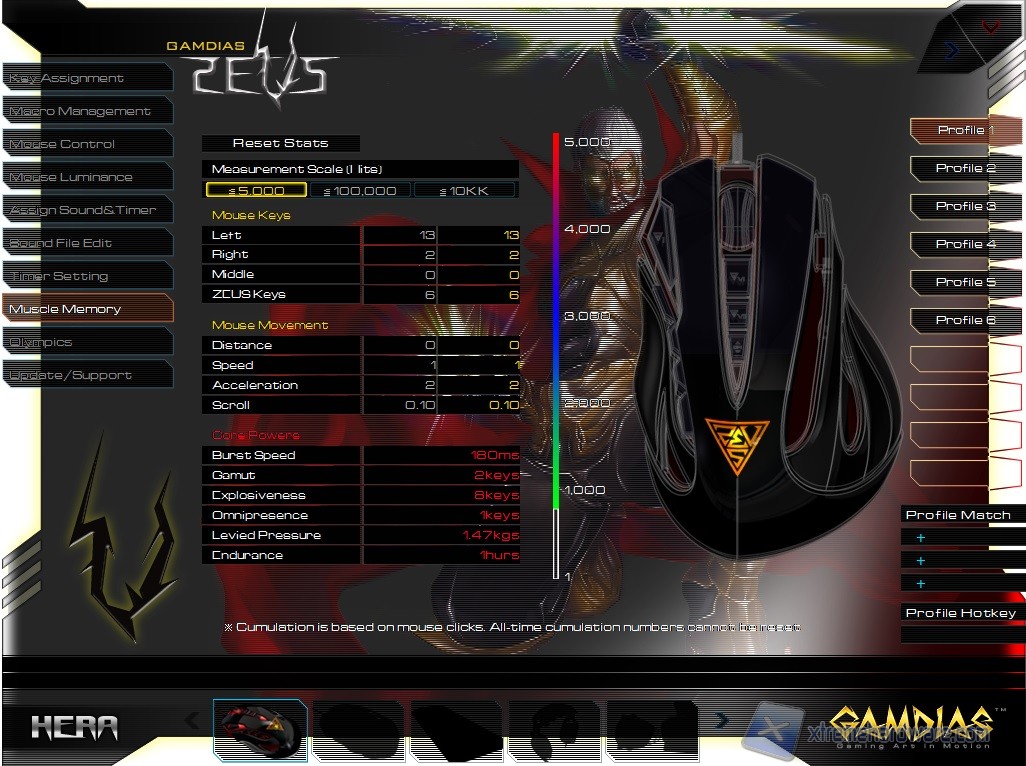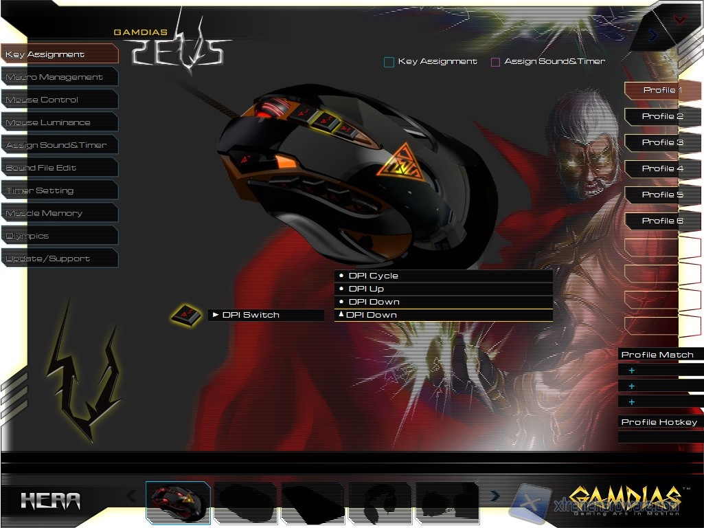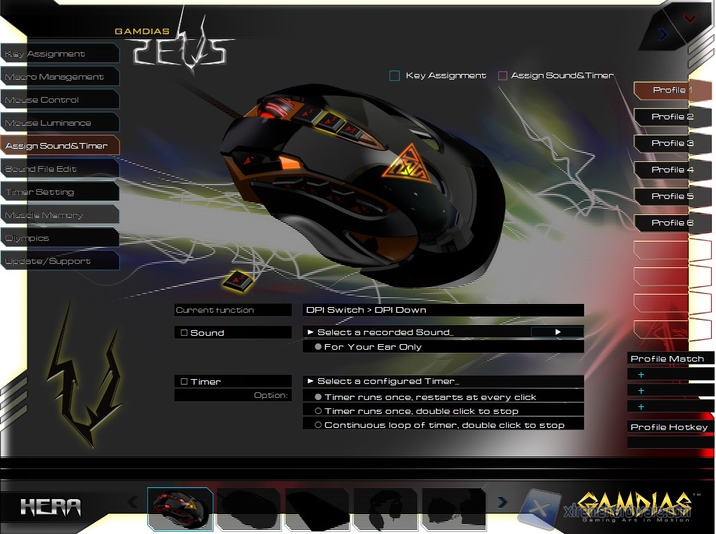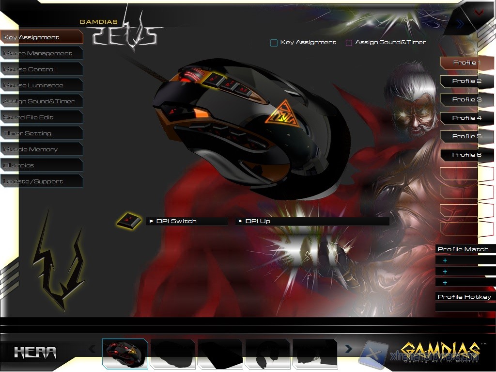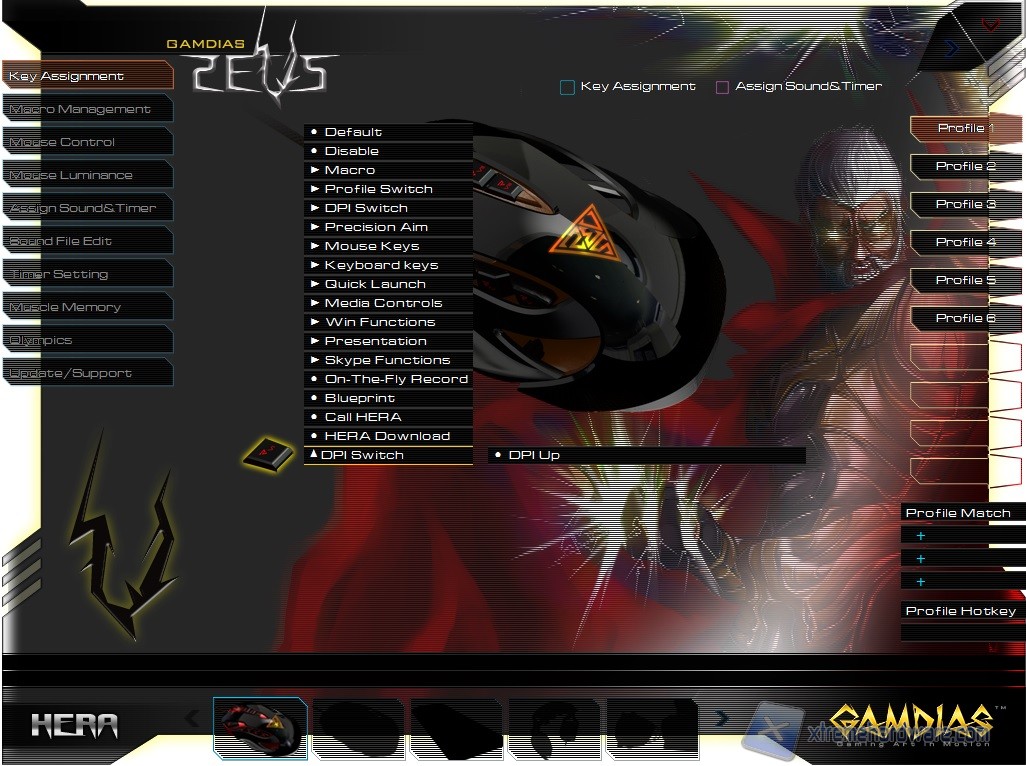 Avviato il programma, notiamo subito un’interfaccia molto aggressiva e colorata ma non per questo caotica. Sono presenti infatti tutte le informazioni necessarie alla personalizzazione delle funzioni. Inoltre il pannello di gestione del mouse è identico a quello della tastiera Hermes. Andiamo ad analizzarli uno alla volta anche se molti Menù sono identici a quelli già visti per la tastiera.