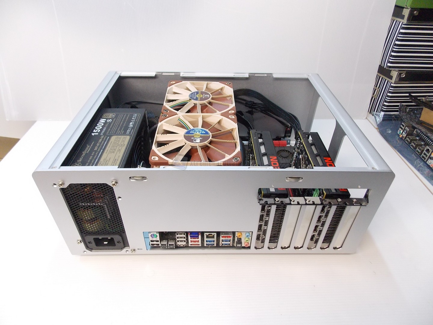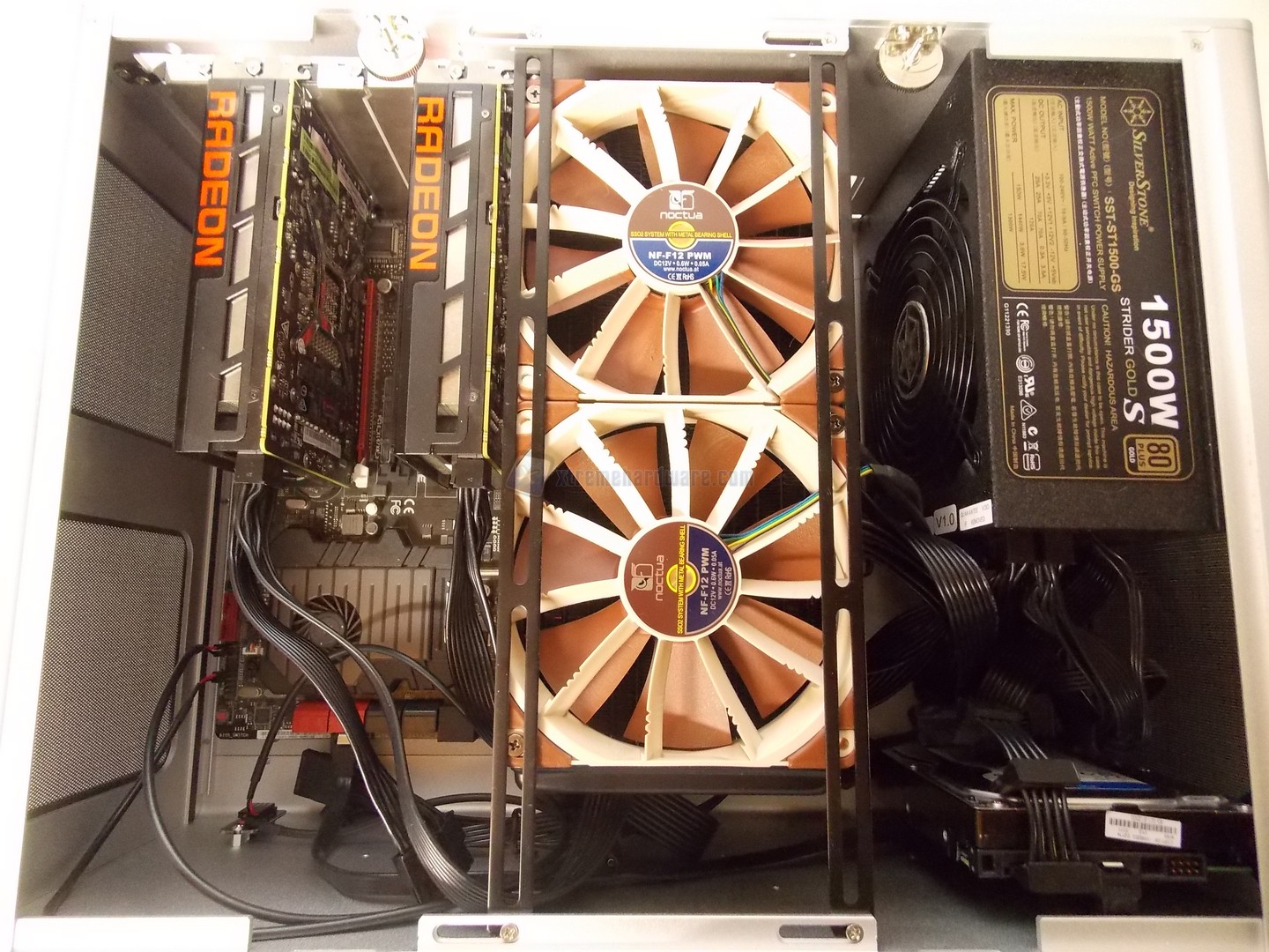La piattaforma X79 utilizzata permette performance al pari delle ultime versioni rilasciate da Intel, scenari totalmente non limitati dalla CPU, e quindi una compatibilità fino potenzialmente a tre schede grafiche in parallelo. Nelle fotografie sottostanti sono state utilizzate per prova due AMD R9 NANO in crossfire, VGA dal basso consumo molto potenti e silenziose, che presentano un formato dimensionale particolarmente contenuto, e quindi perfetto per l'integrazione in sistemi tanto particolari. Si consiglia il montaggio di almeno 16GB per un moderno PC con prestazioni bilanciate.