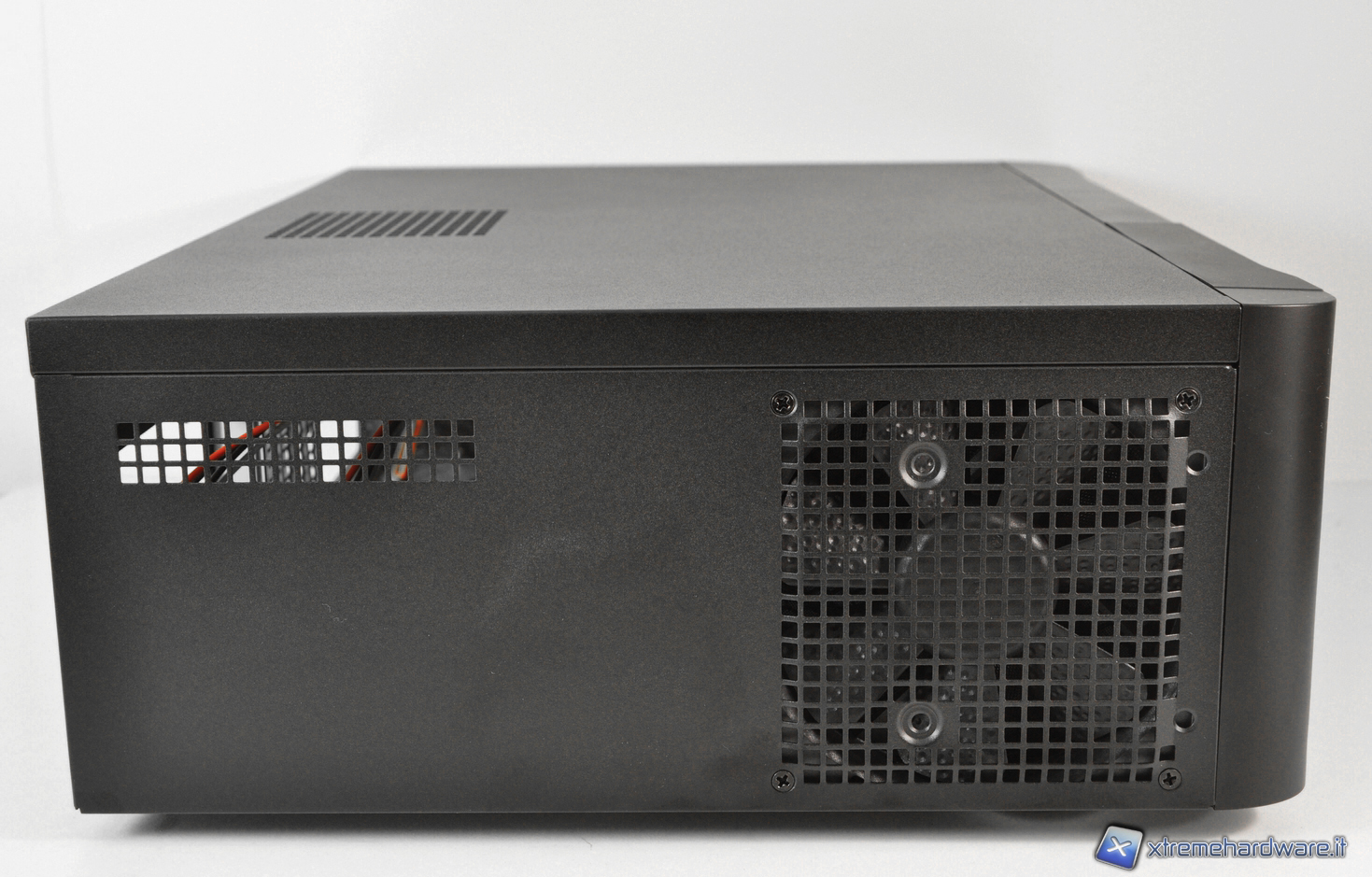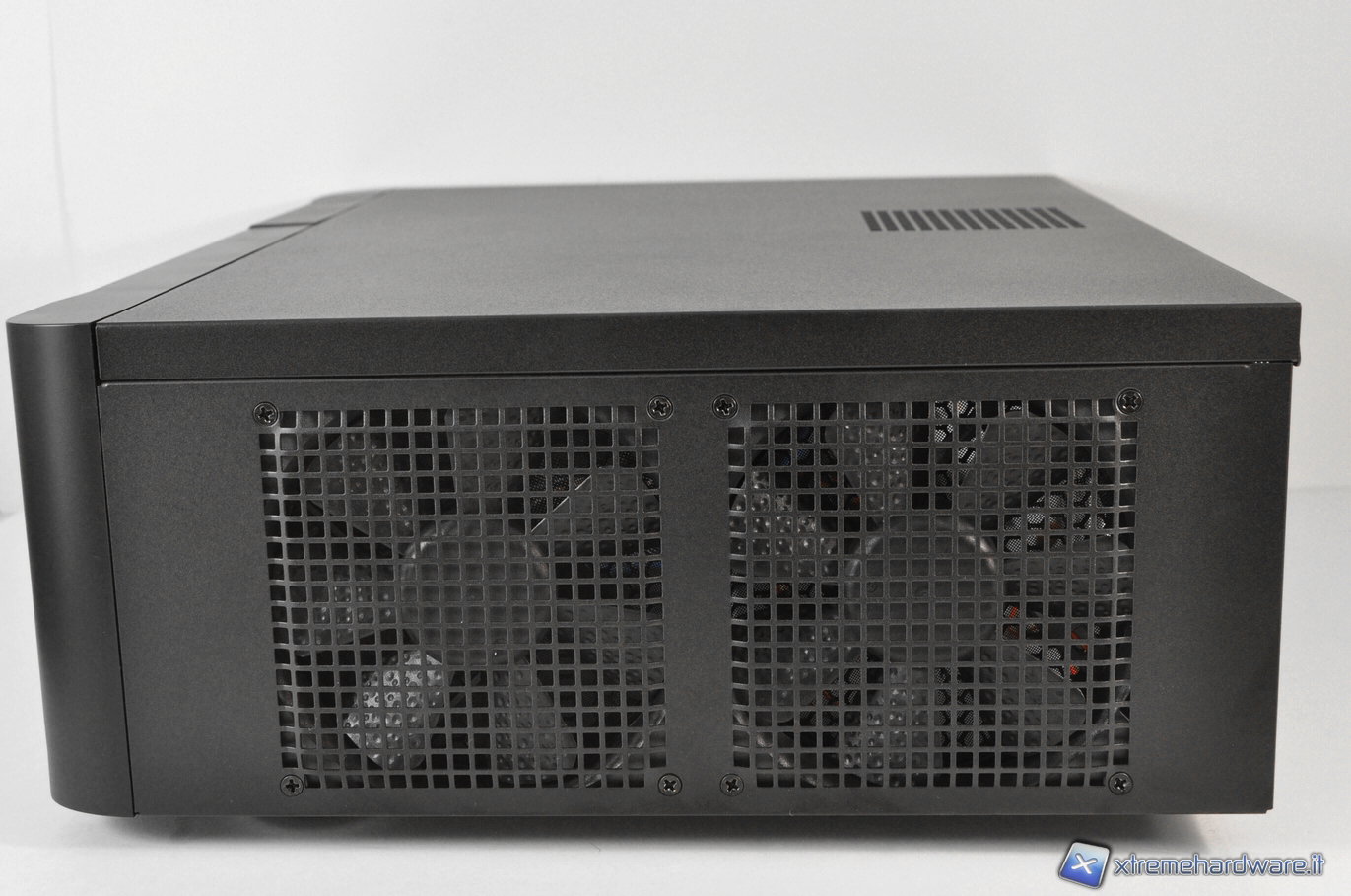 Nella parte sinistra del case troviamo una ventola da 120 mm che ha il compito di raffreddare gli hard-disk installati in modalità Hot Swap. Poco più a sinistra troviamo invece una piccola feritoia che consente di far espellere l’aria calda proveniente dalla zona degli hard-disk. La ventola è dotata di filtro anti-polvere rimuovibile con 4 viti.