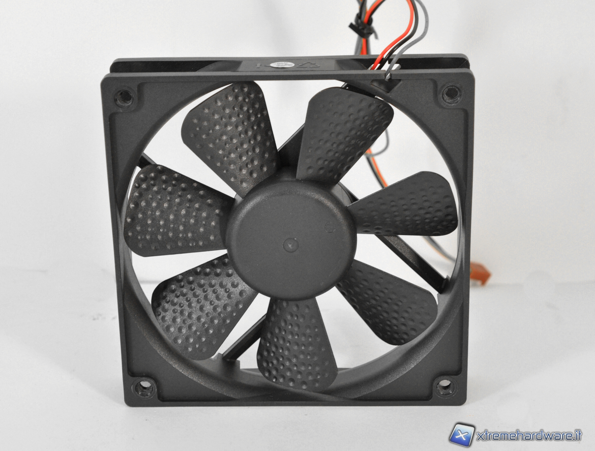 Ecco qui il modello di ventola utilizzata all’interno del case. E’ una ventola da 120 mm con una velocità di rotazione pari a 1200 rpm e caratterizzata da una rumorosità pari a 20 dB(A). Le sue 7 pale presentano un design particolare che massimizza il flusso d’aria all’interno del case.