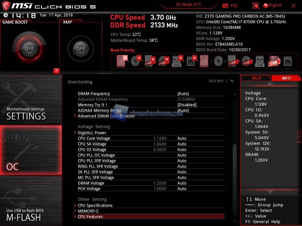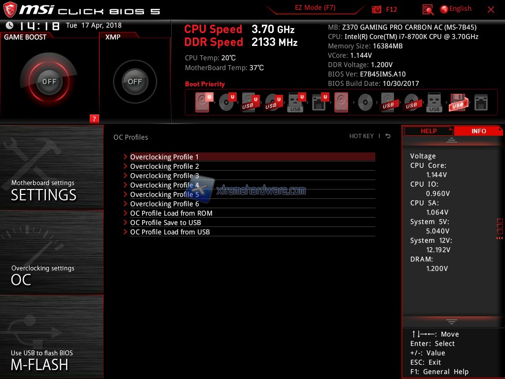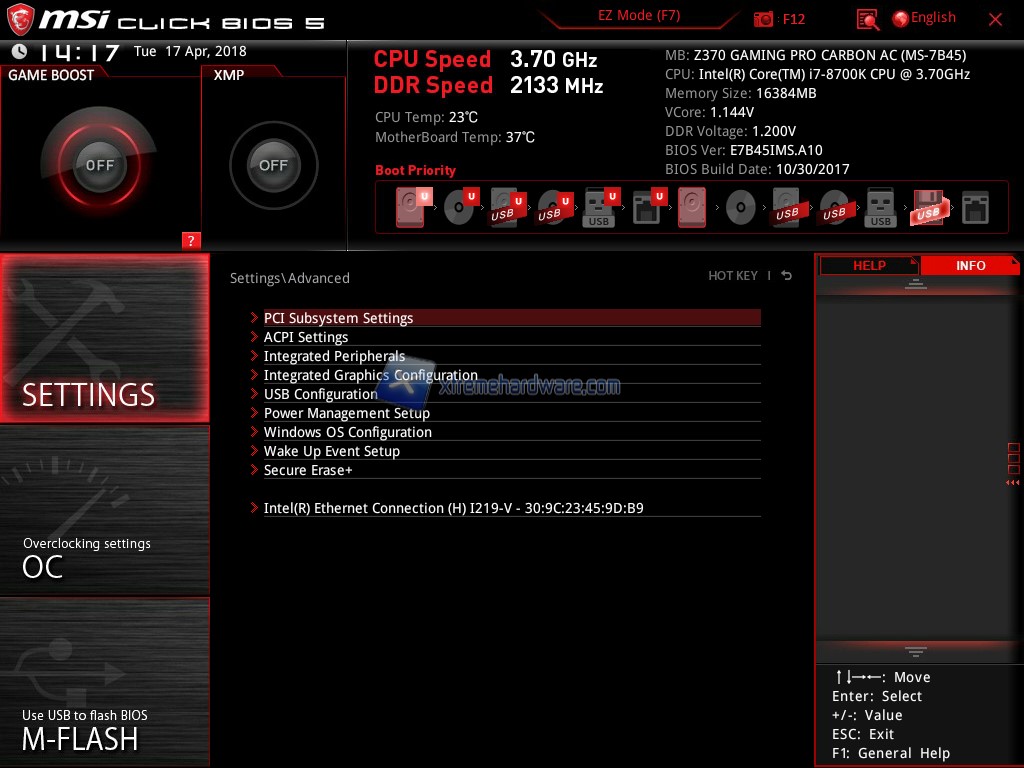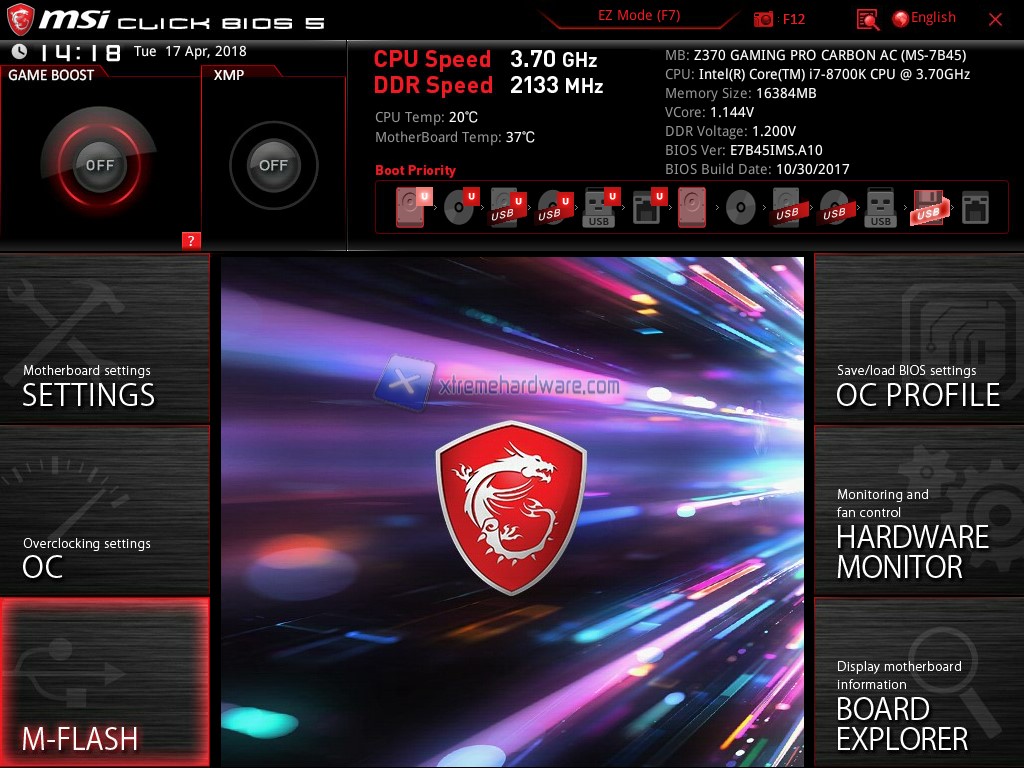 Passiamo ora a dare uno sguardo al BIOS della MSI Z370 Gaming Pro Carbon AC. Una volta entrati nel BIOS della scheda madre possiamo notare la consueta interfaccia MSI Gaming con lo schema di colori Nero/Rosso. Un po' come tutti i BIOS di ultima generazione avremo a disposizione una ‘’EZ Mode’’ ed una ‘’Advanced Mode’’. Ciò permetterà ad un utente base o uno avanzato di poter raggiungere e modificare dovute impostazioni del BIOS.