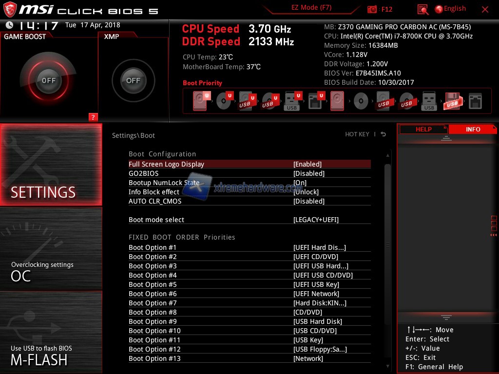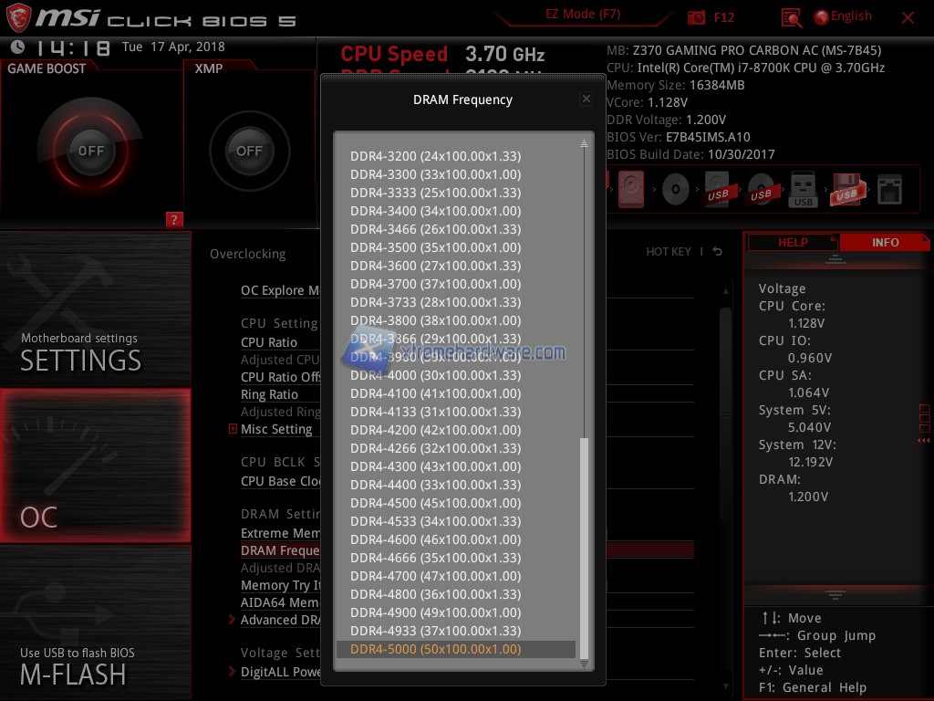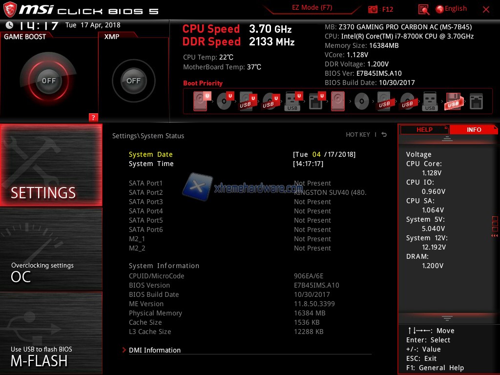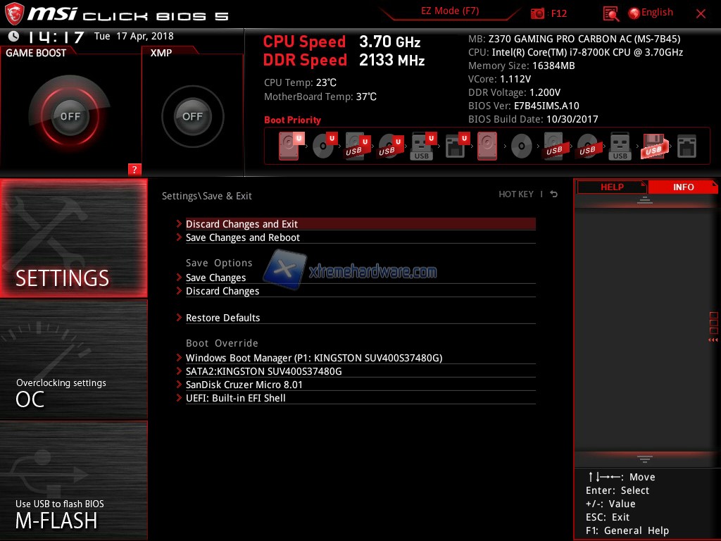 Passiamo ora a dare uno sguardo al BIOS della MSI Z370 Gaming Pro Carbon AC. Una volta entrati nel BIOS della scheda madre possiamo notare la consueta interfaccia MSI Gaming con lo schema di colori Nero/Rosso. Un po' come tutti i BIOS di ultima generazione avremo a disposizione una ‘’EZ Mode’’ ed una ‘’Advanced Mode’’. Ciò permetterà ad un utente base o uno avanzato di poter raggiungere e modificare dovute impostazioni del BIOS.