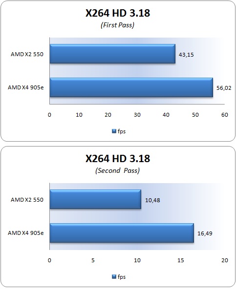La prima è una cpu quadcore nativa dal bassissimo consumo, si pensi che ha un VID di soli 1.1250v, ed è una cpu che scalda pochissimo, si pensi infatti che ha un TDP di soli 65w, mentre la seconda è una cpu dual core dalla frequenza più elevata, 3.1 GHz e 1.3000v di VID. La particolarità di questa cpu è che fa parte della serie "Black Edition", ossia è dotata di moltiplicatore completamente sbloccato sia verso il basso sia verso l'alto. Questo permette per chi overclocka il sistema di raggiungere frequenze elevate in maniera molto semplice. Il Phenom II X2 550be ha un TDP di 80w. I test sono stati eseguiti con le due cpu a default, ossia a frequenza standard.