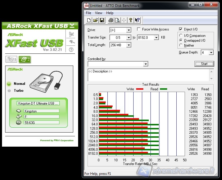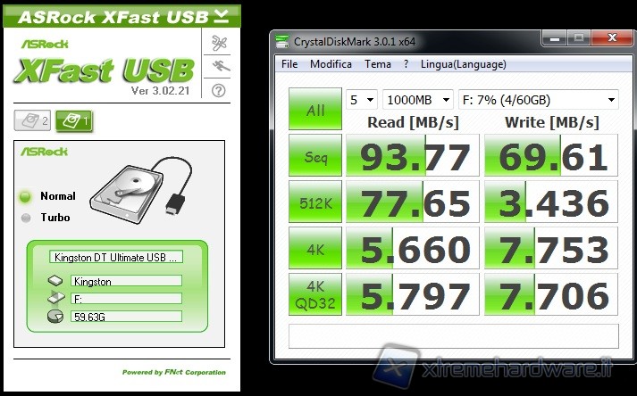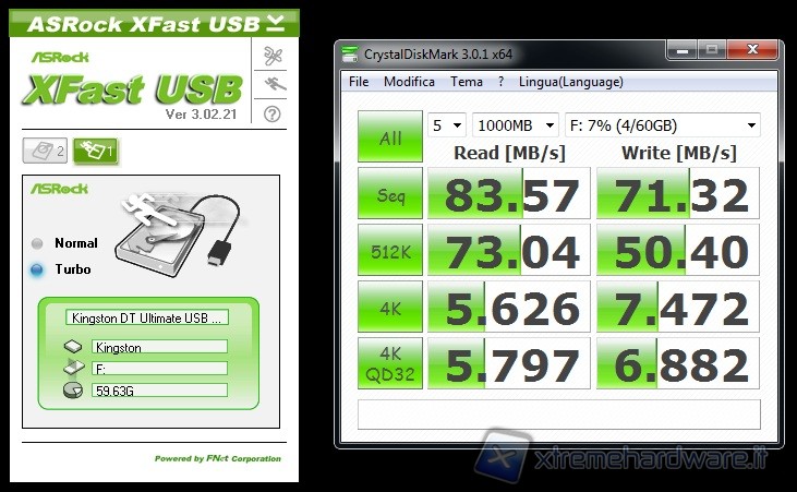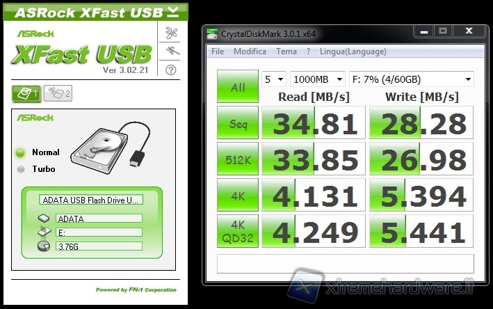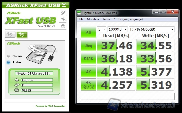 Grazie allo standard USB 3.0 ed alla sua velocità più elevata le differenze in termini di Transfer-Rate sono palesi sia utilizzando ATTO che CrystalDiskMark. Oltretutto il vantaggio derivante dall’uso del tool ASRock XFast USB è palese sia utilizzando una connessione USB2.0 che USB3.0.