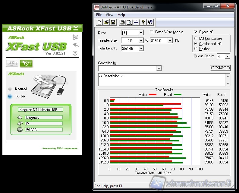 Esaminiamo insieme il Bandwith della Asrock X79 Extreme4 lato connettività sia USB 2.0 che 3.0. Verranno utilizzati ATTO e CrystalDiskMark per misurare i valori di Transfer-Rate connettendo il Pen Drive che abbiamo usato come campione, un Kingston DT Ultimate 64GB, sia ad una porta USB 3.0 che sulla più lenta USB 2.0.